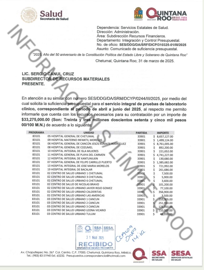 SESA-DA-SRM-III-002-2024 PARA LA ADQUISICIÓN DE REACTIVOS Y MATERIAL PARA EL LABORATORIO ESTATAL DE SALUD PÚBLICA DE QUINTANA ROO POR $33436978 PESOS.