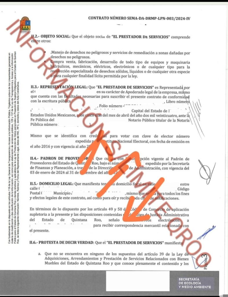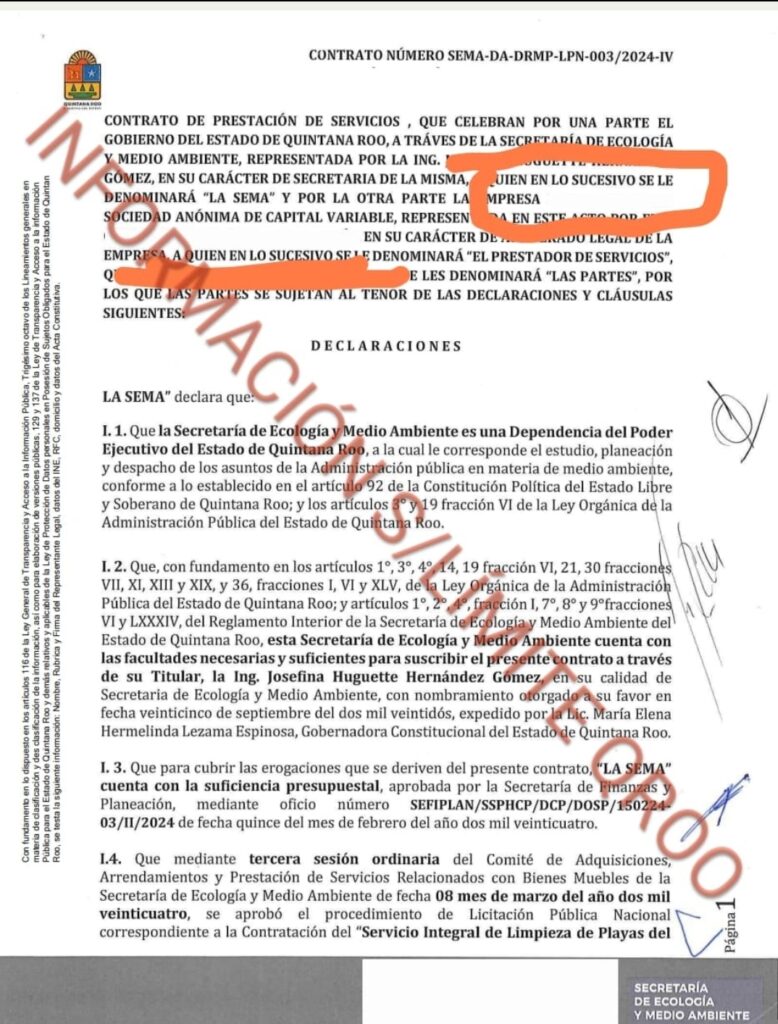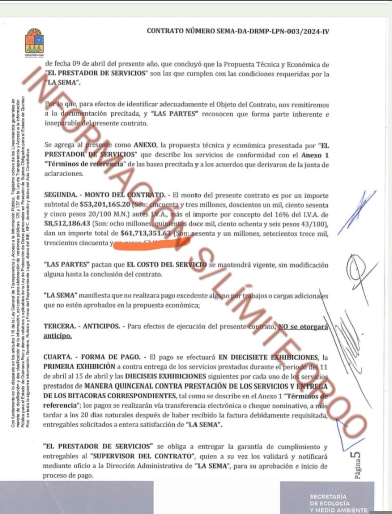 El segundo contrato entregado a Red Recolector fue por casi el triple del monto que en 2023, $61 millones 713 mil 351.63 bajo el numero SEMA-DA-DRMP-LPN-003/2024 para el SERVICIO INTEGRAL DE LIMPIEZA DE PLAYAS DEL ESTADO DE QUINTANA ROO, REALIZANDO EL BARRIDO, REMOCIÓN Y TRASLADO DE SARGAZO A LOS SITIOS DESIGNADOS POR MUNICIPIOS, curiosamente en el contrato fue borrado el nombre de la empresa para proteger tanto al “Niño Verde” como a sus socios.