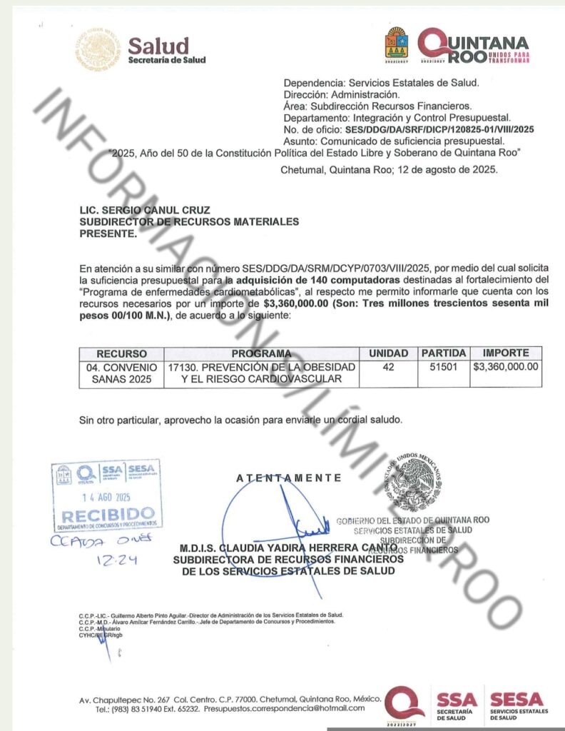 Si la Secretaria de Salud de Quintana Roo hubiera comprado las 140 computadoras en AMAZON les habría costado $1 millón 227 mil 182.20 pesos y se vieran ahorrado $2 millones 152 mil 817 pesos.