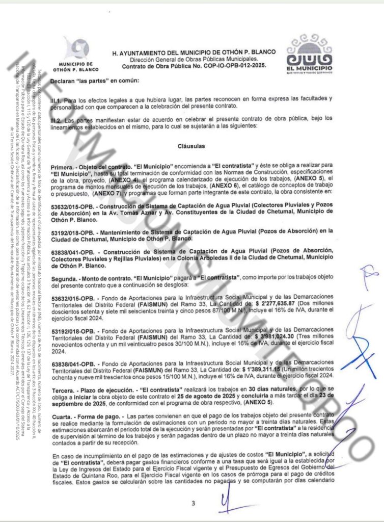 El primer contrato que entrego el ayuntamiento de OPB fue por $3 millones 008 mil 061.92 de pesos al LINIERO de la comisión federal de electricidad en Chetumal Edy Antonio Carrillo Gómez para la construcción de Espacio Multideportivo en la localidad de San Pedro Peralta en el municipio de Othón P Blanco a pesar que no tiene ni la solvencia ni la experiencia en el ramo de la construcción.