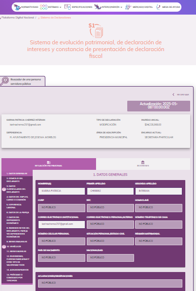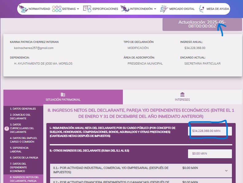 Karina Patricia Cherrez Interian con el puesto de Secretaria Particular del alcalde morenista Erik Borges reporto que obtuvo de ganancias en 2025 por REMUNERACIÓN ANUAL NETA DEL DECLARANTE POR SU CARGO PÚBLICO (POR CONCEPTO DE SUELDOS, HONORARIOS, COMPENSACIONES, BONOS, AGUINALDOS Y OTRAS PRESTACIONES) (CANTIDADES NETAS DESPUÉS DE IMPUESTOS) $34,228,368.00 (TREINTA Y CUATRO MILLONES DOSCIENTOS VEINTI Y OCHO MIL SEISCIENTOS SESENTA Y OCHO PESOS) al Sistema de evolución patrimonial, de declaración de intereses y constancia de presentación de declaración fiscal.