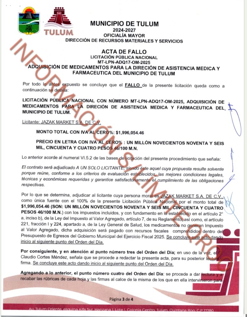 Diego Castañón a través de la oficial mayor del ayuntamiento Jessica Ramírez de la Rosa, del director de asistencia medica del ayuntamiento Marcelo Jesús Torres Arana y Claudio Cortes Méndez por Adjudicación Directa le entregaron el contrato MT/OM/RMS/RF/ADQ/LPN/047/2025 por $1 millón 996 mil 054.46 pesos para la compra de medicamento a la empresa JAZAK MARKET, S.A. DE C.V. dedicada a la venta de electrodomésticos poniendo en riesgo sanitario a los ciudadanos tulumnenses.