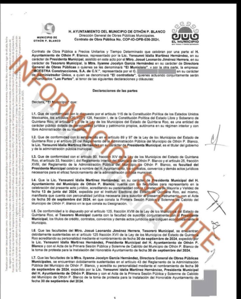 La alcaldesa de Othón P Blanco Yensunni Martínez en contubernio del tesorero municipal Josué Leonardo Jiménez Herrera, por la directora de obras públicas Ilyanne Jocelyn García Hernández y bajo la supervisión del presidente de la Comisión de Obras y Servicios Públicos del Cabildo Othonense Daniel Linares Téllez-Girón entregaron de manera irregular en este 2025 contratos de obras públicas a empresas Fantasmas, Improvisadas y a sus compadres de la alcaldesa morenista sin importarle violar la Ley General de Obras Públicas.