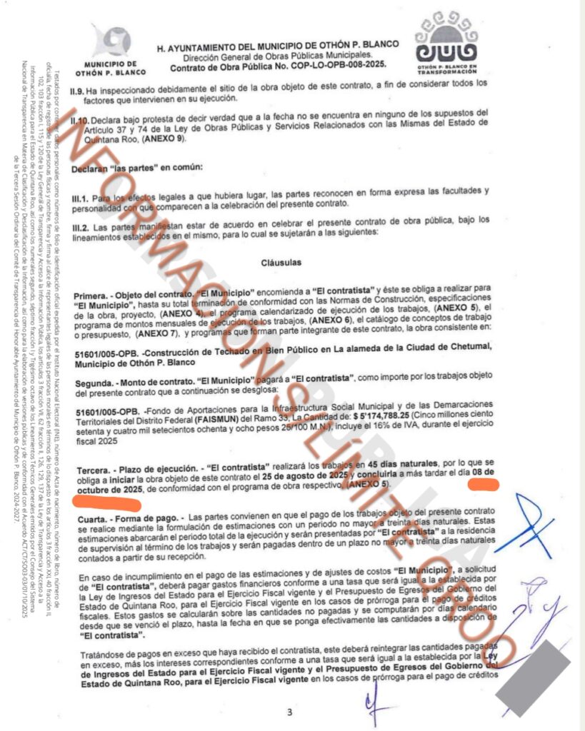 Bajo el numero de contrato COP-LO-OPB-008-2025 el ayuntamiento de Othón P Blanco le regalo recursos federales a la empresa MOESTRA propiedad del presidente de la CMIC para la Construcción de Techado en Bien Público en la Alameda de la cuidad de Chetumal, obra que debió de comenzar el 25 de agosto de 2025 y finalizar a mas tardar el día 08 de octubre de 2025, sin embargo esta obra hasta el día 13 de octubre de 2025 tiene un avance del 30 % sin que ninguna autoridad multe a la empresa por el incumplimiento de contrato ya que es del presidente de la CMIC.