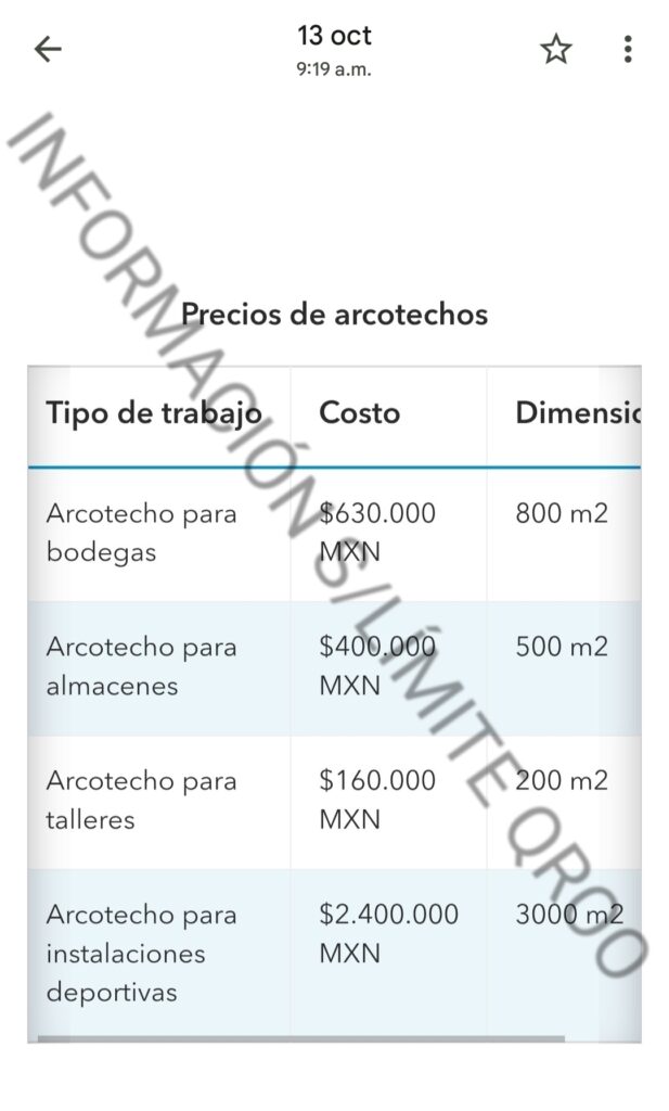 Este Arcotecho que es mas económico que un domo tiene aproximadamente 1800 m2, el día 13 de octubre de 2025 solicitamos una cotización aproximado del precio de ese domo con las mismas características por la cual 3000 m2 cuesta $2 millones 400 mil pesos, $800 pesos por metro de arcotecho.