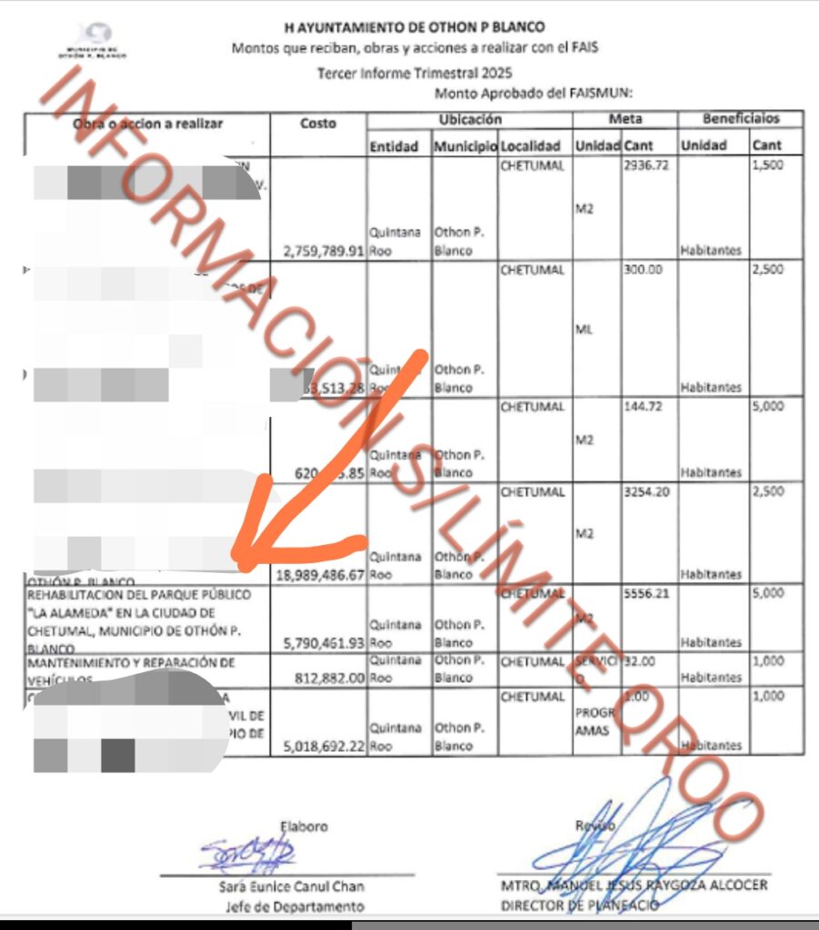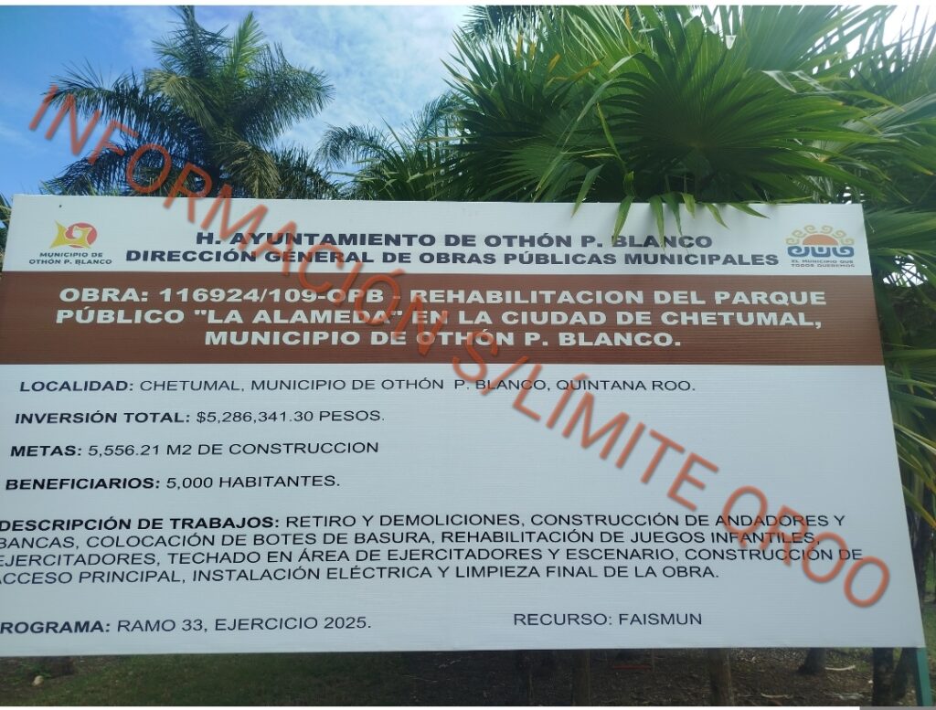 Bajo el numero de contratos COP-LO-OPB-004-2025 el ayuntamiento de Othón P Blanco reporto a la federación el pago de $5 millones 790 mil 461.73 pesos a la empresa Ordar S.A de C.V del FAIS Municipal y de las Demarcaciones Territoriales del Distrito Federal para la rehabilitación del parque publico “La Alameda” ubicado en la Avenida Álvaro obregón Colonia Centro 77000 CHETUMAL, OTHÓN P. BLANCO ENTRE Calle Rafael E. Melgar Y Calle Emiliano Zapata Calle Ignacio Zaragoza que se encuentra a un costado de palacio municipal y registro civil.