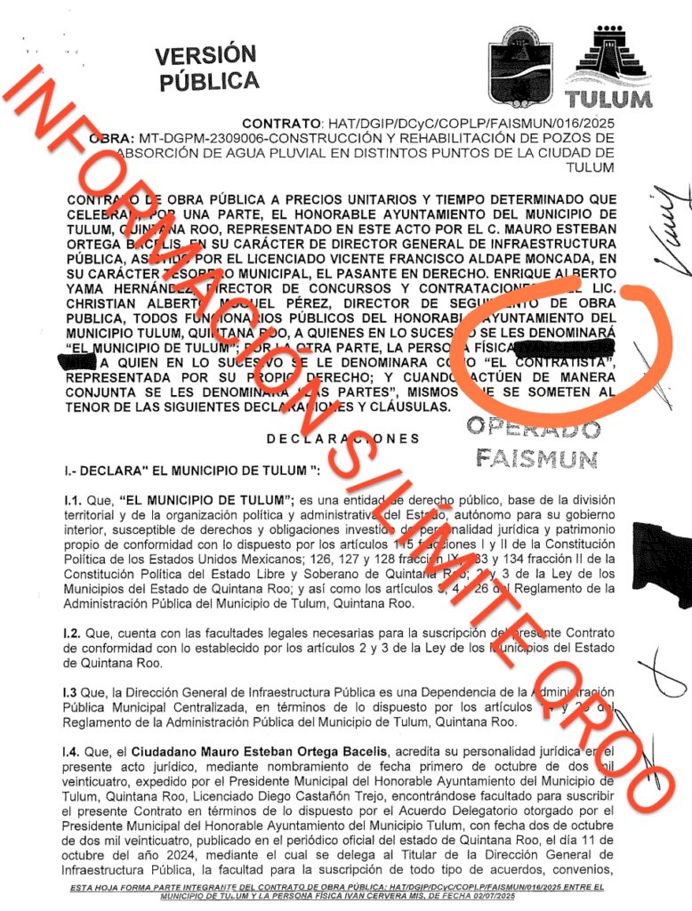 Simulando el ayuntamiento de Tulum una licitación publica, bajo el numero de contrato HAT/DGIP/DCyC/COPLP/ FAISMUN/016/2025 le entregaron a modo al director de la primara pública con plaza en Valladolid Iván Cervera Mis, $3 millones 933 mil 240.59 pesos ( mediante pagos por transferencias bancarias) para la Construcción y rehabilitación de pozos de absorción de agua pluvial en distintos puntos de la ciudad de Tulum, el ayuntamiento se nego a darnos la informacion de los punto donde se realizo dichos trabajos.