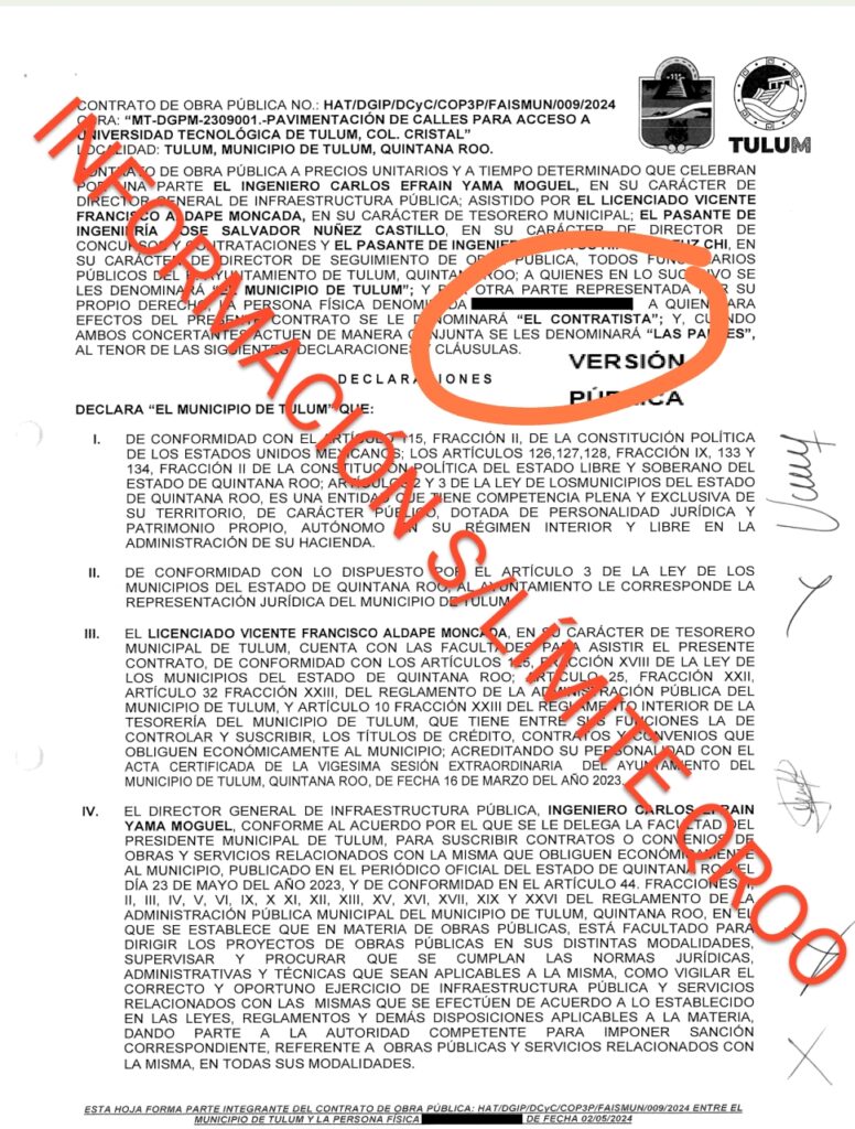 En los cuatro contratos entregados al director de la escuela de Valladolid Iván Cervera Mis de parte del ayuntamiento de Tulum fueron ocultados su nombre y su firma, el contrato duplicado en 2023 y donde se desvio mas de $2.7 MDP fue extraviado la documentación.