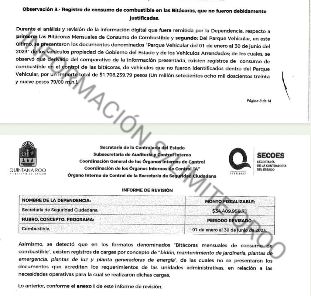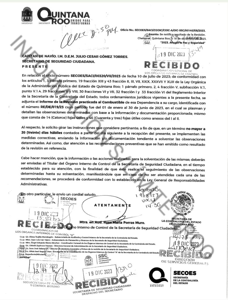 La SABGOB mediante el oficio número SSC/DS/SSPYF/1422/VII/2023 realizo la Auditoria a los recursos asignados a esa Secretaría de Seguridad Ciudadana del Estado de Quintana Roo bajo el mando de Julio Cesar Gómez Torres para el cumplimiento de sus objetivos, el Órgano Interno de Control llevó a cabo una revisión a las partidas presupuestales 26101 Combustible y 26103 Combustible para Vehículos Especializados, suministrado a los vehículos al servicio de la SCCQROO.
