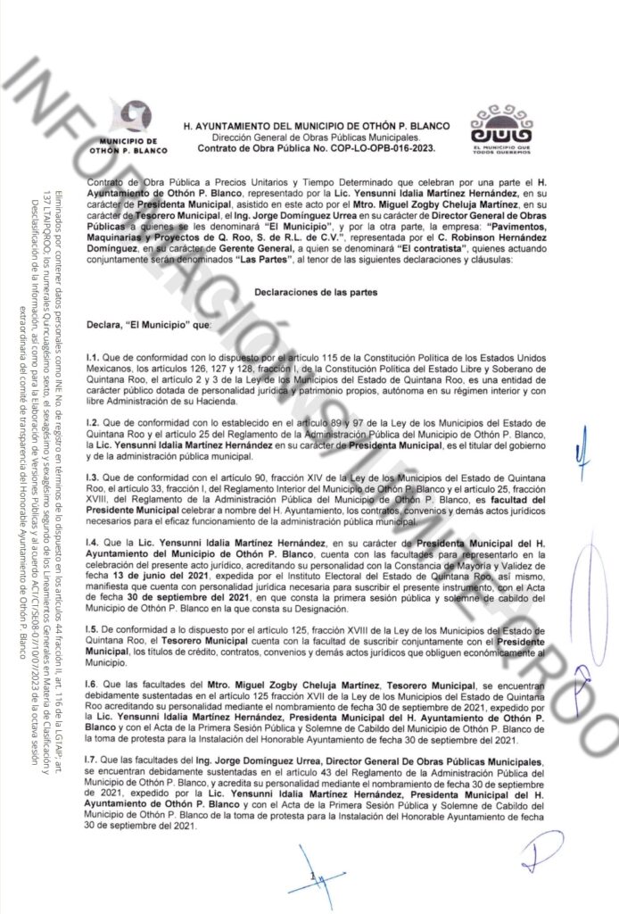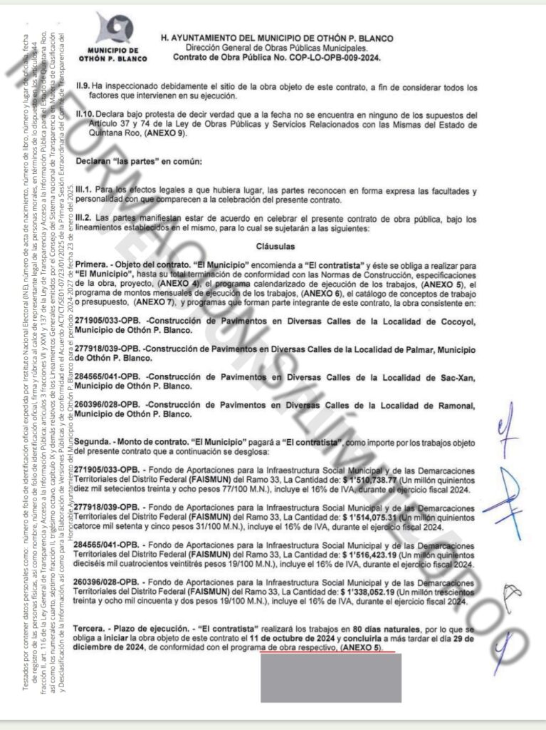 Para que no se vea abultado el monto del contrato lo distribuyeron en partes, $685 mil 698.38 pesos para la construcción de Pavimentos en la calle Ramón F Iturbe entre CNC y 2⁰ Circuito en la cuidad de Chetumal, $814,431.28 para la construcción de pavimentos en la comunidad 5 de mayo, $743,660 para la construcción de pavimentos en la calle luis cabrera entre Felipe ángeles y calzada Veracruz (esta obra hasta el día de hoy 10 de septiembre de 2025 no se ha realizado) y $685,751 peso para la construcción de pavimentos sobre la calle Librado E Rivera entre CNC y Marciano González colonia Adolfo López Mateos.