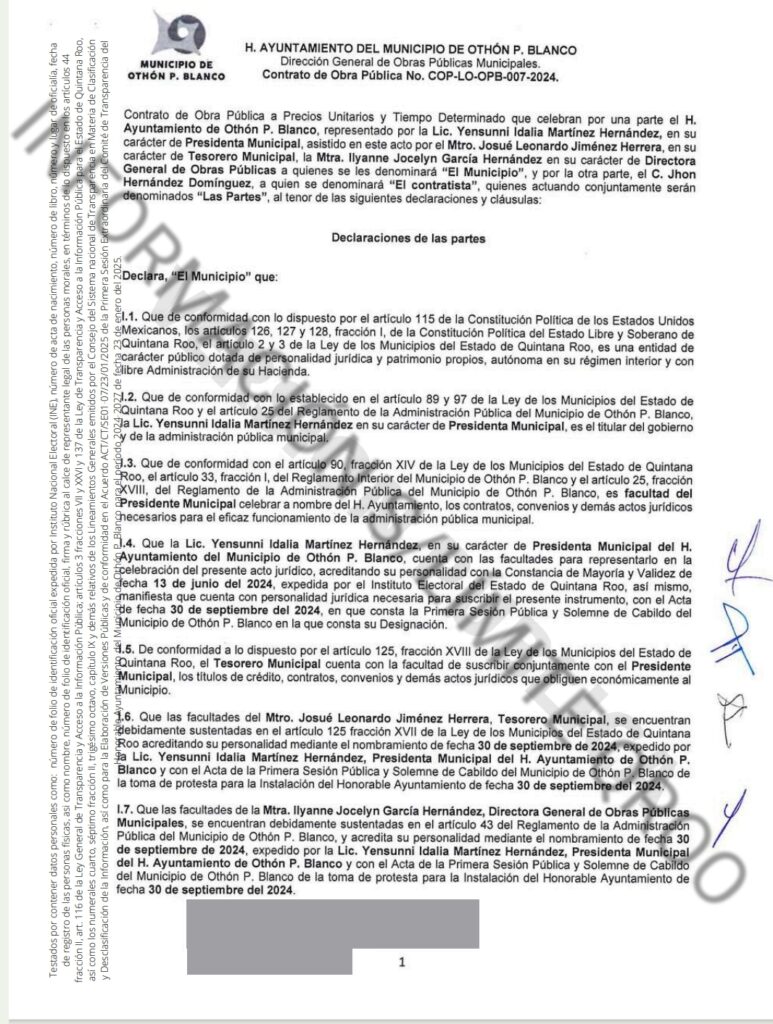 Ya para el 2024 en total complicidad de la nueva administración, Yensunni Martínez coludido ahora con el tesorero Josué Leonardo Jiménez Herrera y con la directora de obras públicas Ilyanne Jocelyn García Hernández le entregaron a Jhon Hernández sin ningún problema dos contratos de obras públicas a su nombre y uno mas por medio de la empresa Pavimentos, Maquinarias y Proyectos de Qroo, todos por adjudicación directa .